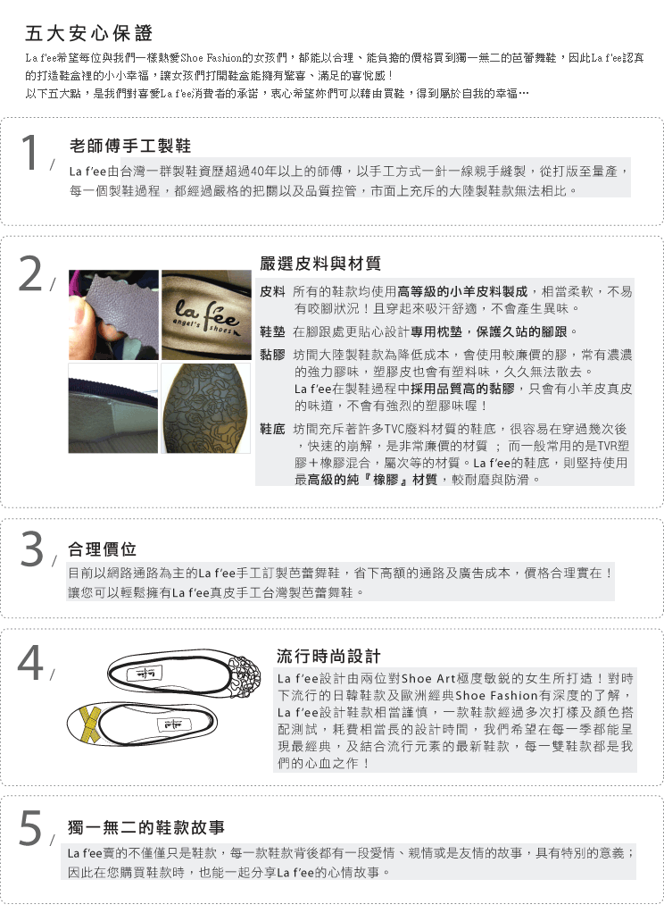 | 目前La f'ee 推出的鞋款大部分是簡約氣質的娃娃鞋! 經典款式配上輕盈的色系,很適合夏天!! La f'ee 除了款式經典之外 最重要的是鞋子材質是走高品質路線喔!! 不僅是台灣老師傅手工打造 皮料更是選用舒適好穿的高級小羊皮~ 趕緊看看La f'ee的安心保證!! |