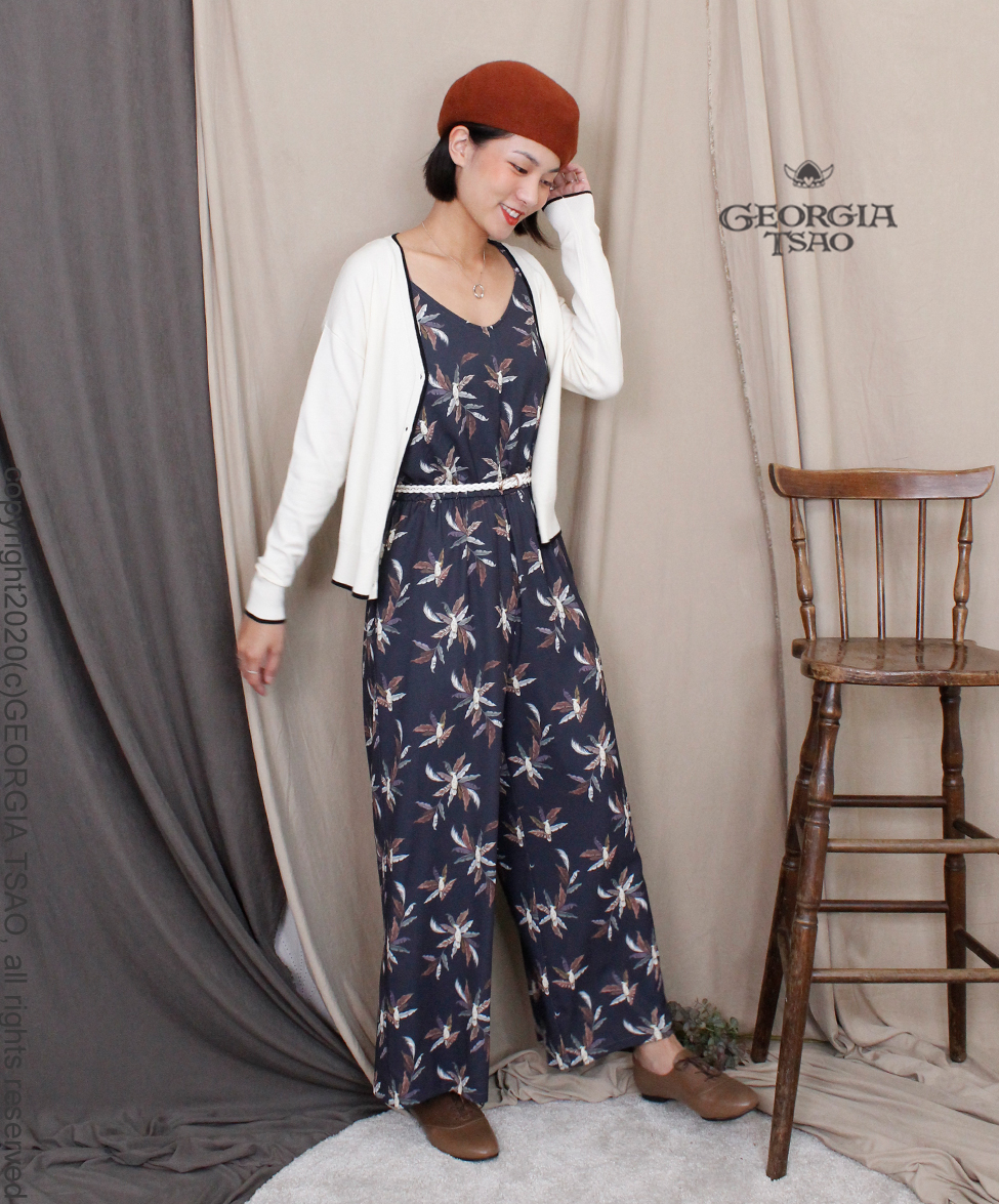 GT自印花布製作成的V領細肩帶連身寬褲